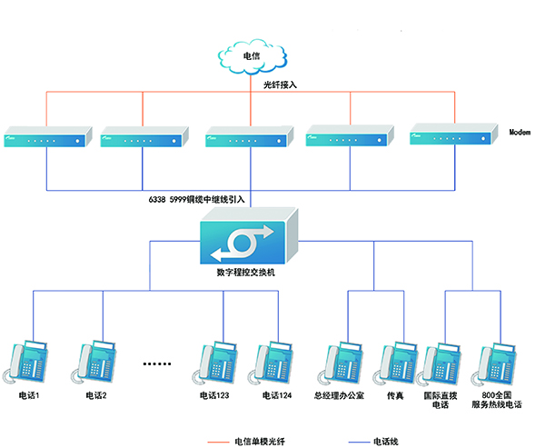 根據以上要求,公司語音通信系統采用集團電話數字程控交換機實現多終端語音通信功能。根據綜合布線子系統,本系統設計滿足120個終端使用,系統接入6部普通外線號碼及4部專用語音外線號碼,通過光纖解調器統一接入程控交換機。系統選用擴容型插卡結構數字程控機,配置為8外線104分機,交換機所有模塊均采用插卡結構,在維護、升級機器中,分機卡與外線卡通用(8外線一個卡/8分機一個卡),擴容方便,節約成本,系統可擴容至16外線128分機,滿足擴展性的要求。